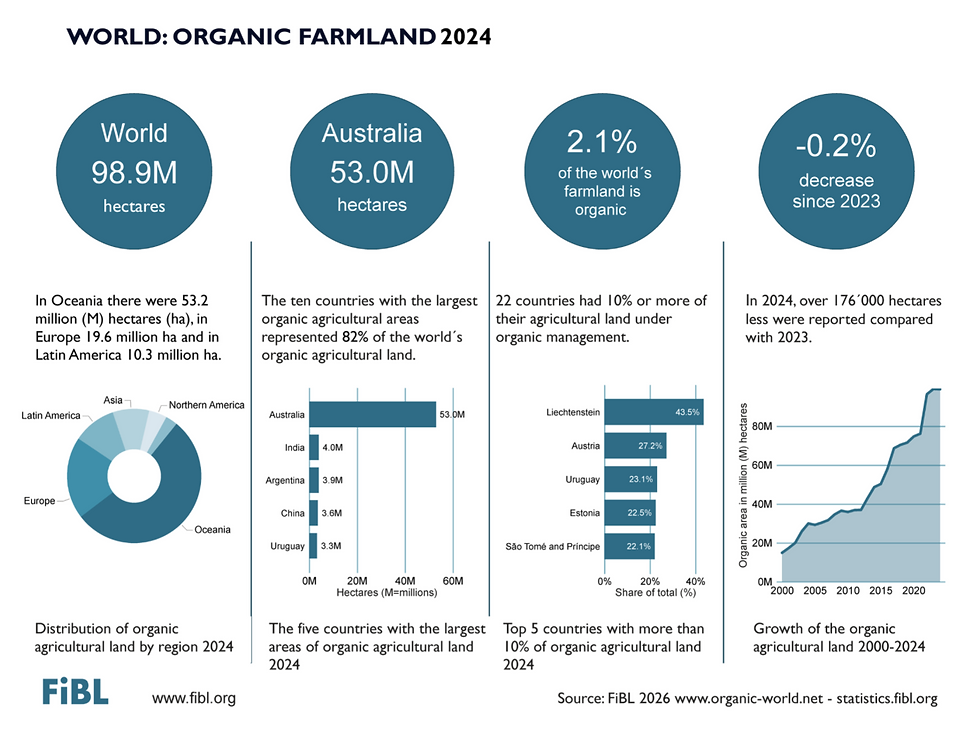 Source: The World of Organic Agriculture 2026: Statistics and Emerging Trends is the leading global reference for organic sector data on land area, producers, markets and international trade, compiled by FiBL in cooperation with IFOAM – Organics International and national data partners. The yearbook can be downloaded at https://shop.fibl.org (item number 1861)